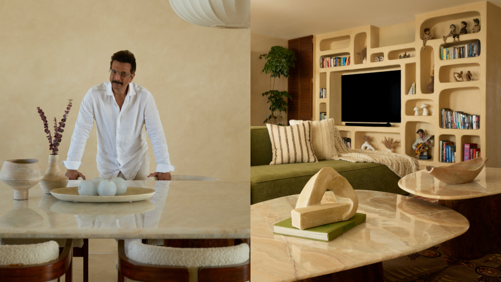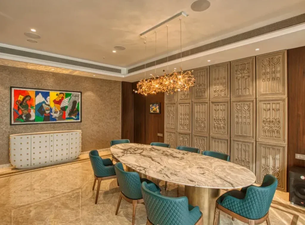 The apartment features original artworks by M.F. Husain, created exclusively for her. Designed by architect Apoorva Shroff, it blends elegance with warmth, placing the art at the heart of the design. Tip: Build your decor around a single art piece or collection.